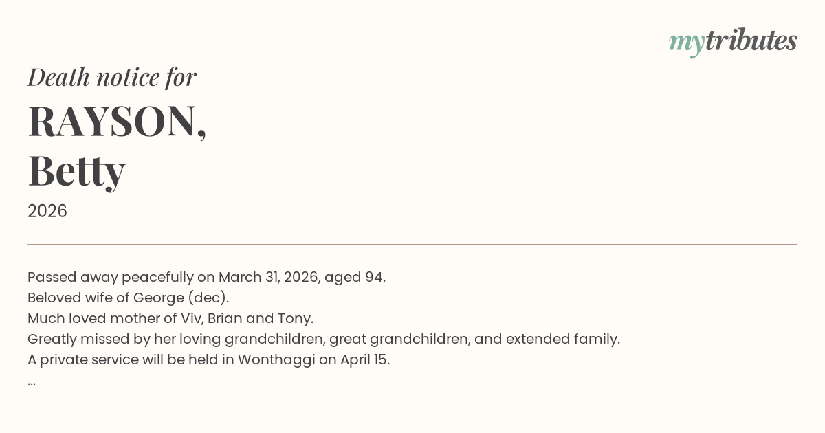19°CPassed away peacefully on March 31, 2026, aged 94.