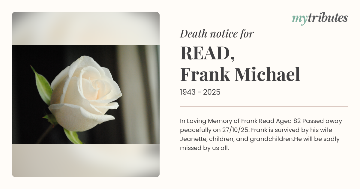 Frank is survived by his wife Jeanette, children, and grandchildren.