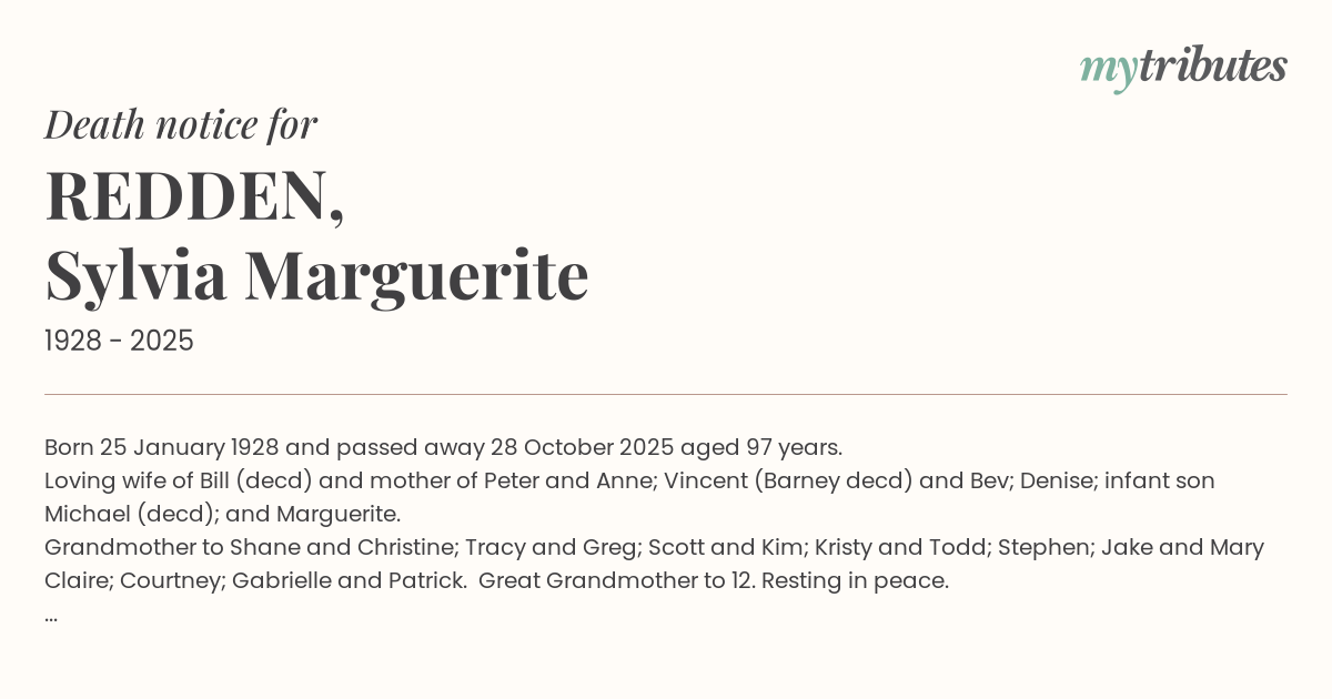 19°CBorn 25 January 1928 and passed away 28 October 2025 aged 97 years.