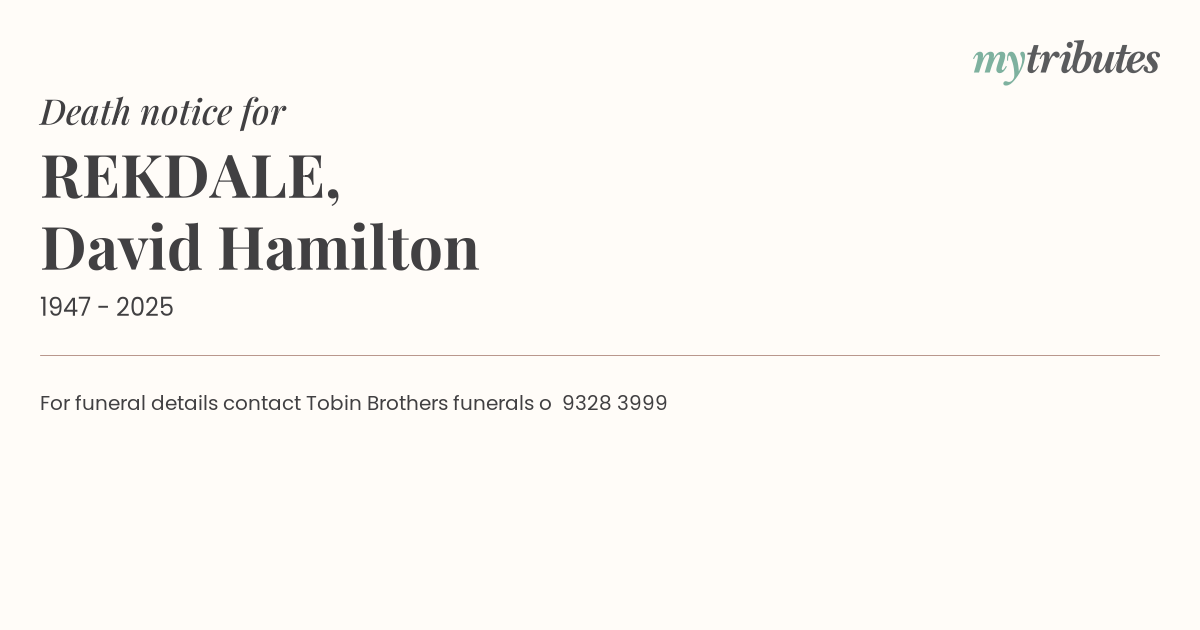 19°CFor funeral details contact Tobin Brothers funerals o 9328 3999