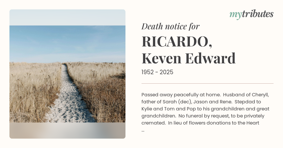 19°CPassed away peacefully at home. Husband of Cheryll, father of Sarah (dec), Jason and Rene. Stepdad to Kylie and Tom and Pop to his grandchildren and great grandchildren. No funeral by request, to be privately cremated. In lieu of flowers donations to the Heart Foundation would be appreciated.
