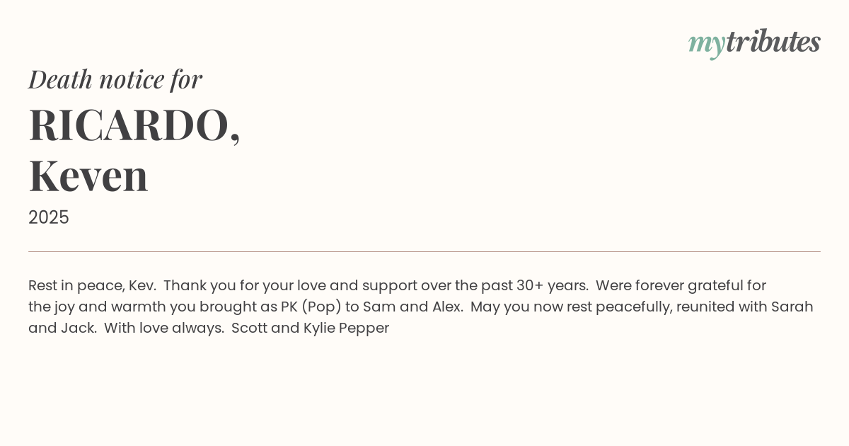 19°CRest in peace, Kev. Thank you for your love and support over the past 30+ years. We’re forever grateful for the joy and warmth you brought as PK (Pop) to Sam and Alex. May you now rest peacefully, reunited with Sarah and Jack. With love always. Scott and Kylie Pepper