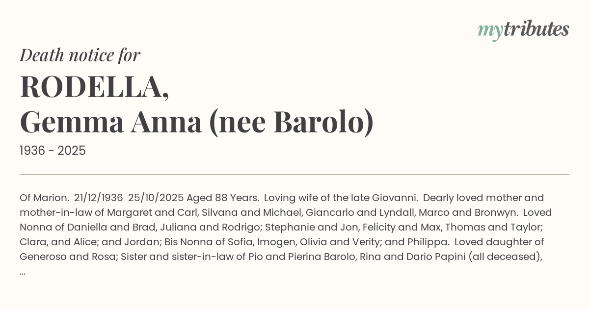 19°COf Marion. 21/12/1936 – 25/10/2025 Aged 88 Years. Loving wife of the late Giovanni. Dearly loved mother and mother-in-law of Margaret and Carl, Silvana and Michael, Giancarlo and Lyndall, Marco and Bronwyn. Loved Nonna of Daniella and Brad, Juliana and Rodrigo; Stephanie and Jon, Felicity and Max, Thomas and Taylor; Clara, and Alice; and Jordan; Bis Nonna of Sofia, Imogen, Olivia and Verity; and Philippa. Loved daughter of Generoso and Rosa; Sister and sister-in-law of Pio and Pierina Barolo, Rina and Dario Papini (all deceased), Maria and Giulio Contessa, Peter and Mary Barolo. Loved by their families. A loving, caring and selfless lady, who gave total devotion to her family. She will be deeply missed by all who knew her.