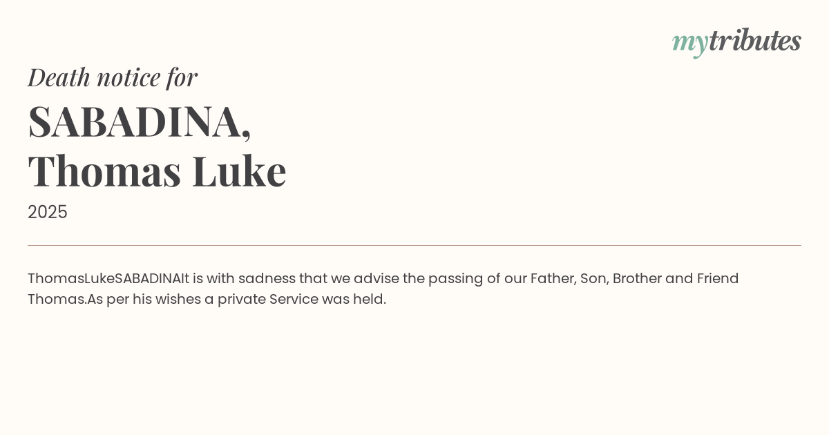 It is with sadness that we advise the passing of our Father, Son, Brother and Friend Thomas.