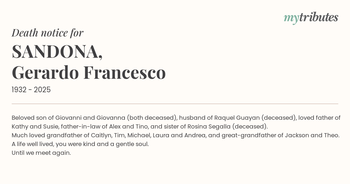 19°CBeloved son of Giovanni and Giovanna (both deceased), husband of Raquel Guayan (deceased), loved father of Kathy and Susie, father-in-law of Alex and Tino, and sister of Rosina Segalla (deceased).