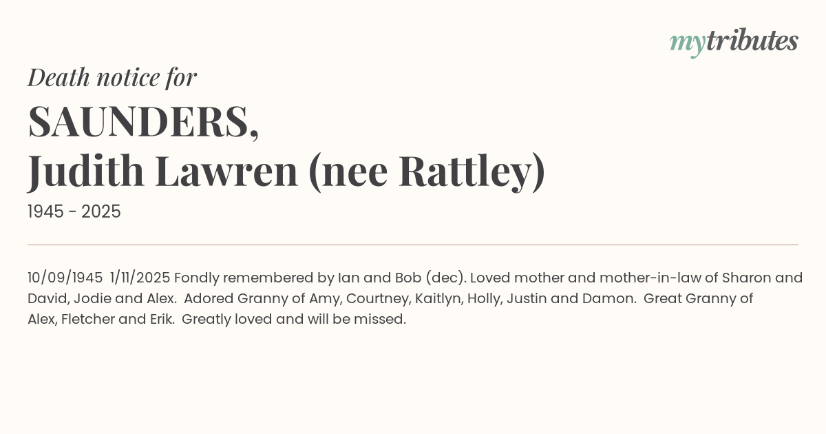19°C10/09/1945 – 1/11/2025 Fondly remembered by Ian and Bob (dec). Loved mother and mother-in-law of Sharon and David, Jodie and Alex. Adored Granny of Amy, Courtney, Kaitlyn, Holly, Justin and Damon. Great Granny of Alex, Fletcher and Erik. “Greatly loved and will be missed”.
