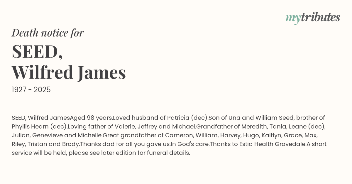 Son of Una and William Seed, brother of Phyllis Hearn (dec).
