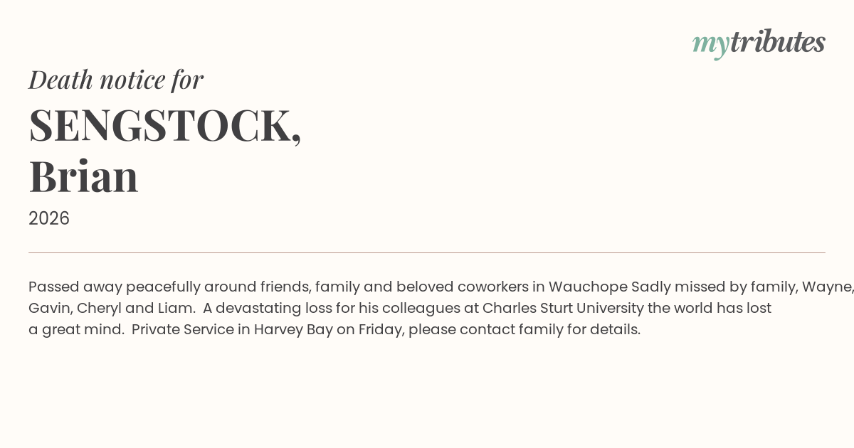 Sadly missed by family, Wayne, Gavin, Cheryl and Liam. A devastating loss for his colleagues at Charles Sturt University the world has lost a great mind.