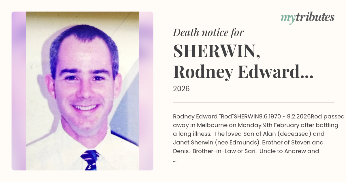 Rod passed away in Melbourne on Monday 9th February after battling a long illness. The loved Son of Alan (deceased) and Janet Sherwin (nee Edmunds). Brother of Steven and Denis. Brother-in-Law of Sari. Uncle to Andrew and Joel. Gruncle to Liara. Grandson of William and Mabel Sherwin (both deceased) of Townsville and Lawrence and Enid Edmunds (both deceased) of Mackay.