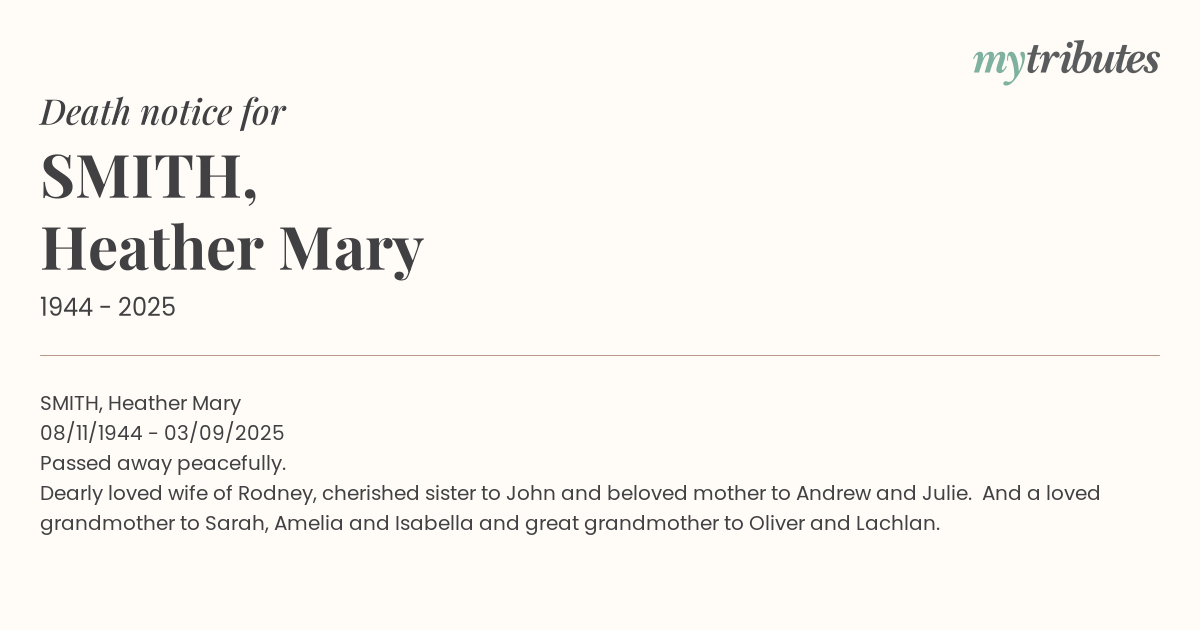 Dearly loved wife of Rodney, cherished sister to John and beloved mother to Andrew and Julie. And a loved grandmother to Sarah, Amelia and Isabella and great grandmother to Oliver and Lachlan.