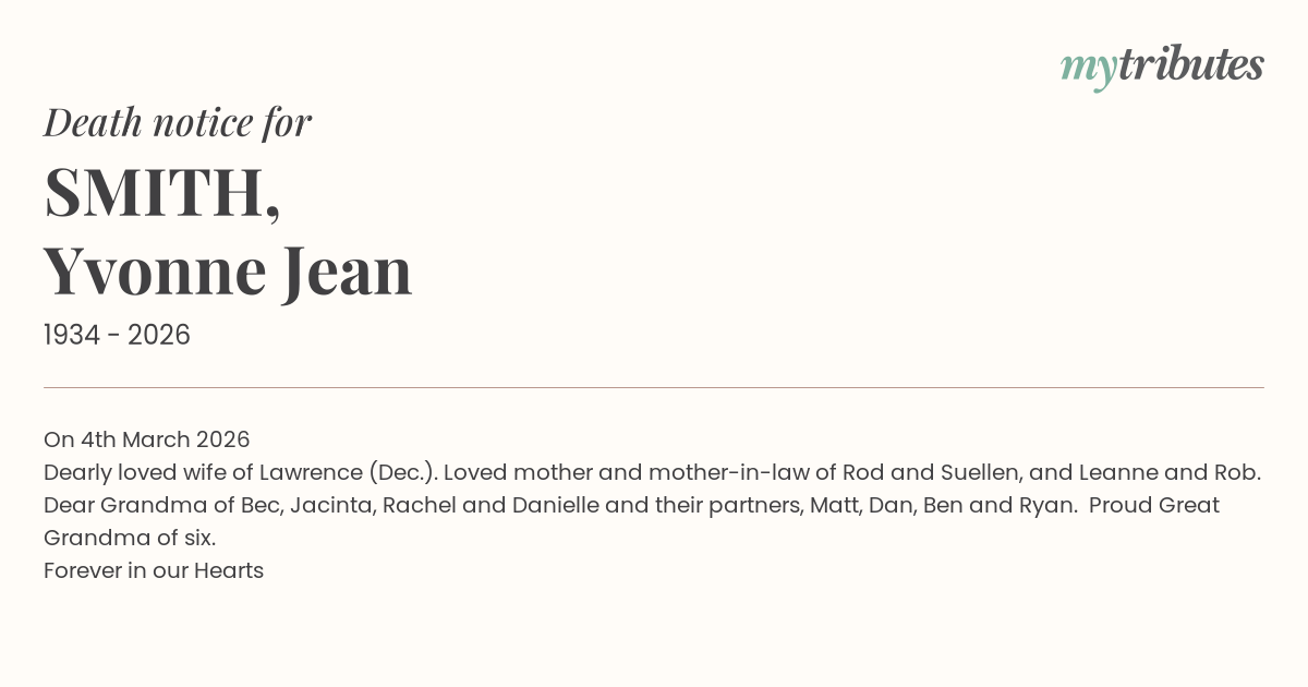 Dearly loved wife of Lawrence (Dec.). Loved mother and mother-in-law of Rod and Suellen, and Leanne and Rob. Dear Grandma of Bec, Jacinta, Rachel and Danielle and their partners, Matt, Dan, Ben and Ryan. Proud Great Grandma of six.