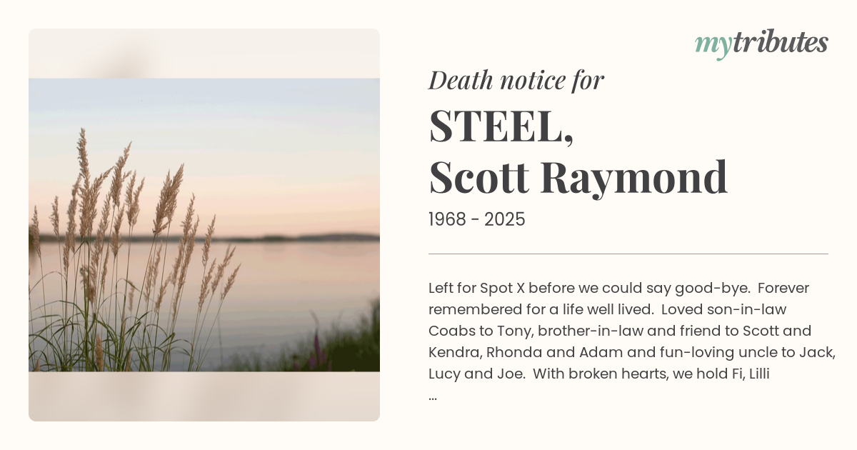 19°CLeft for Spot X before we could say good-bye. Forever remembered for a life well lived. Loved son-in-law ‘Coabs’ to Tony, brother-in-law and friend to Scott and Kendra, Rhonda and Adam and fun-loving uncle to Jack, Lucy and Joe. With broken hearts, we hold Fi, Lilli and Chloe close now and forever