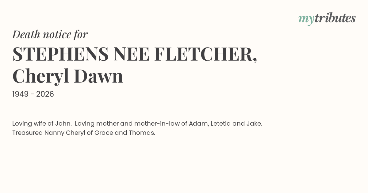 19°CLoving wife of John. Loving mother and mother-in-law of Adam, Letetia and Jake.