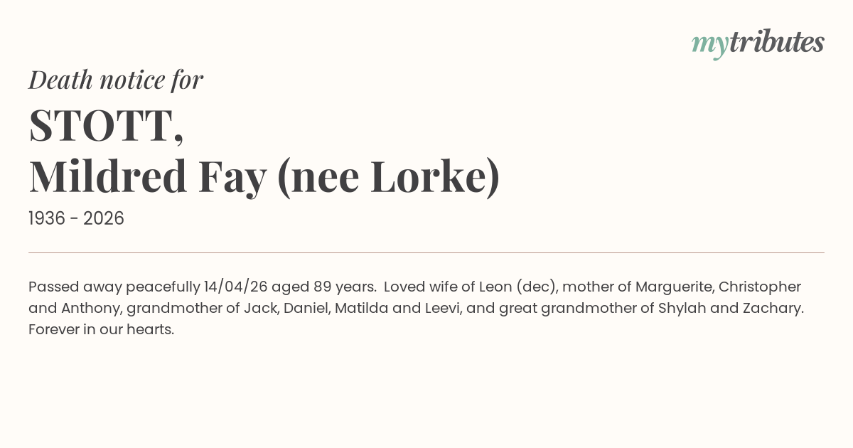 19°CPassed away peacefully 14/04/26 aged 89 years. Loved wife of Leon (dec), mother of Marguerite, Christopher and Anthony, grandmother of Jack, Daniel, Matilda and Leevi, and great grandmother of Shylah and Zachary. Forever in our hearts.