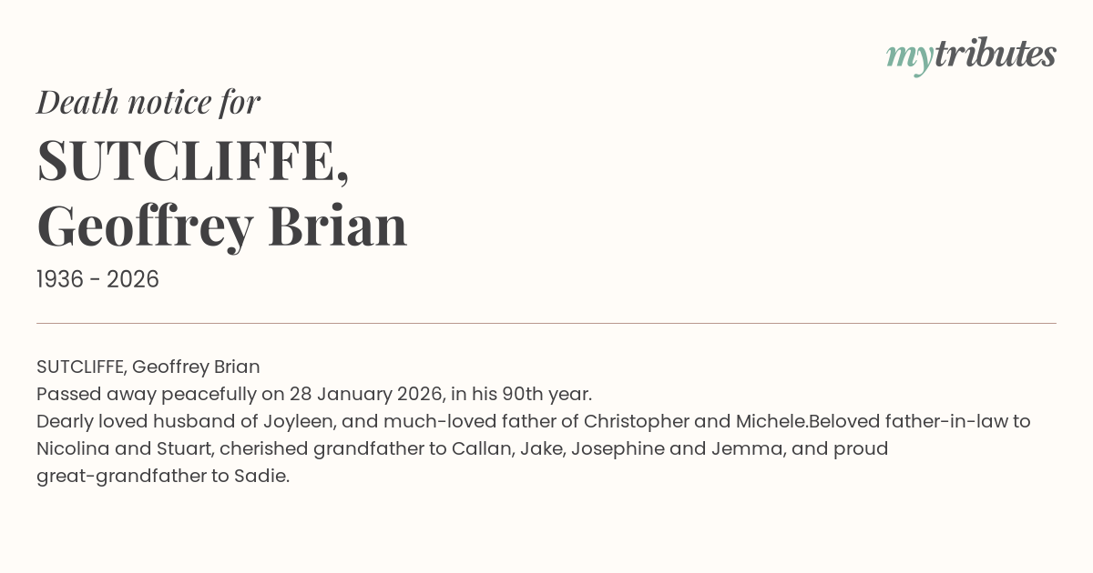 Passed away peacefully on 28 January 2026, in his 90th year.