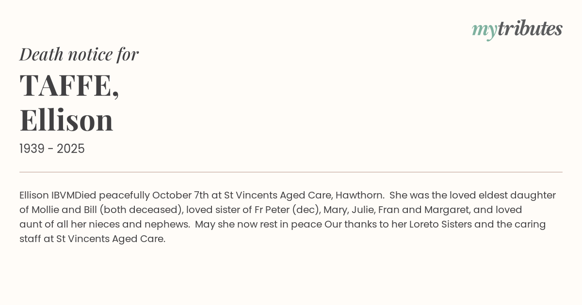 She was the loved eldest daughter of Mollie and Bill (both deceased), loved sister of Fr Peter (dec), Mary, Julie, Fran and Margaret, and loved aunt of all her nieces and nephews.