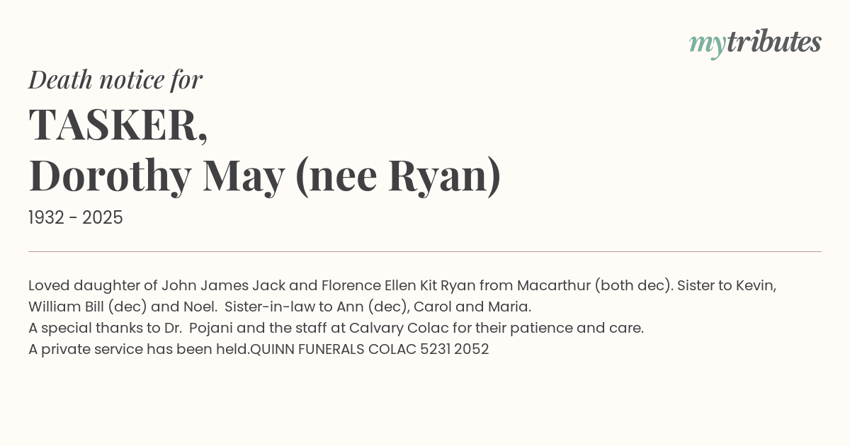 19°CLoved daughter of John James ‘Jack’ and Florence Ellen ‘Kit’ Ryan from Macarthur (both dec). Sister to Kevin, William ‘Bill’ (dec) and Noel. Sister-in-law to Ann (dec), Carol and Maria. A special thanks to Dr. Pojani and the staff at Calvary Colac for their patience and care. A private service has been held.