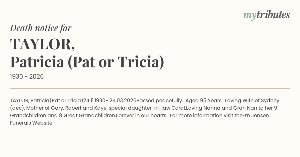 Loving Wife of Sydney (dec), Mother of Gary, Robert and Kaye, special daughter-in-law Coral.