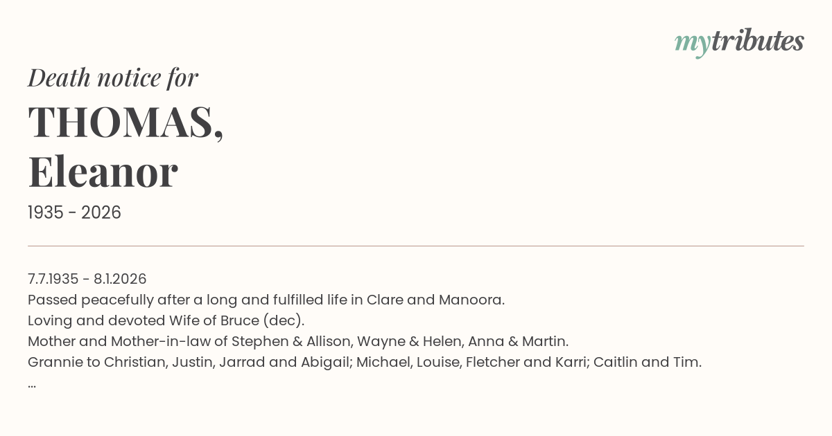 Passed peacefully after a long and fulfilled life in Clare and Manoora.