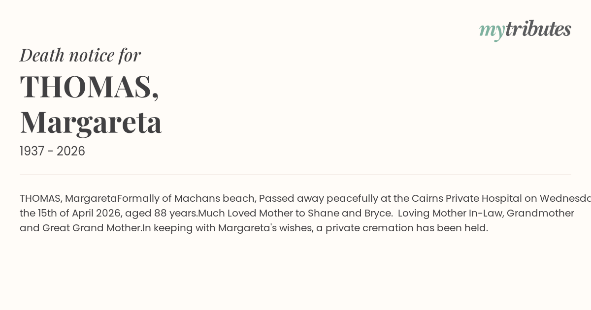 Formally of Machans beach, Passed away peacefully at the Cairns Private Hospital on Wednesday the 15th of April 2026, aged 88 years.