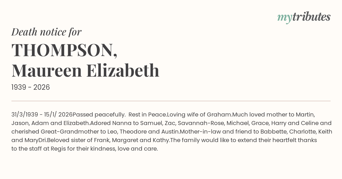 Adored Nanna to Samuel, Zac, Savannah-Rose, Michael, Grace, Harry and Celine and cherished Great-Grandmother to Leo, Theodore and Austin.