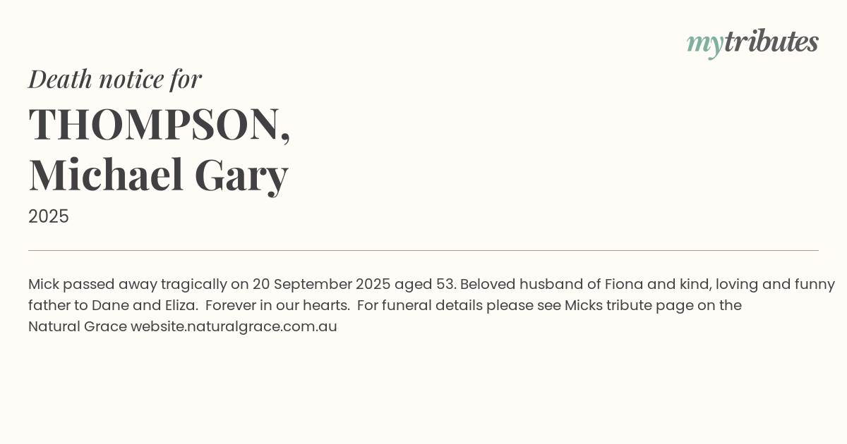 19°CMick passed away tragically on 20 September 2025 aged 53.