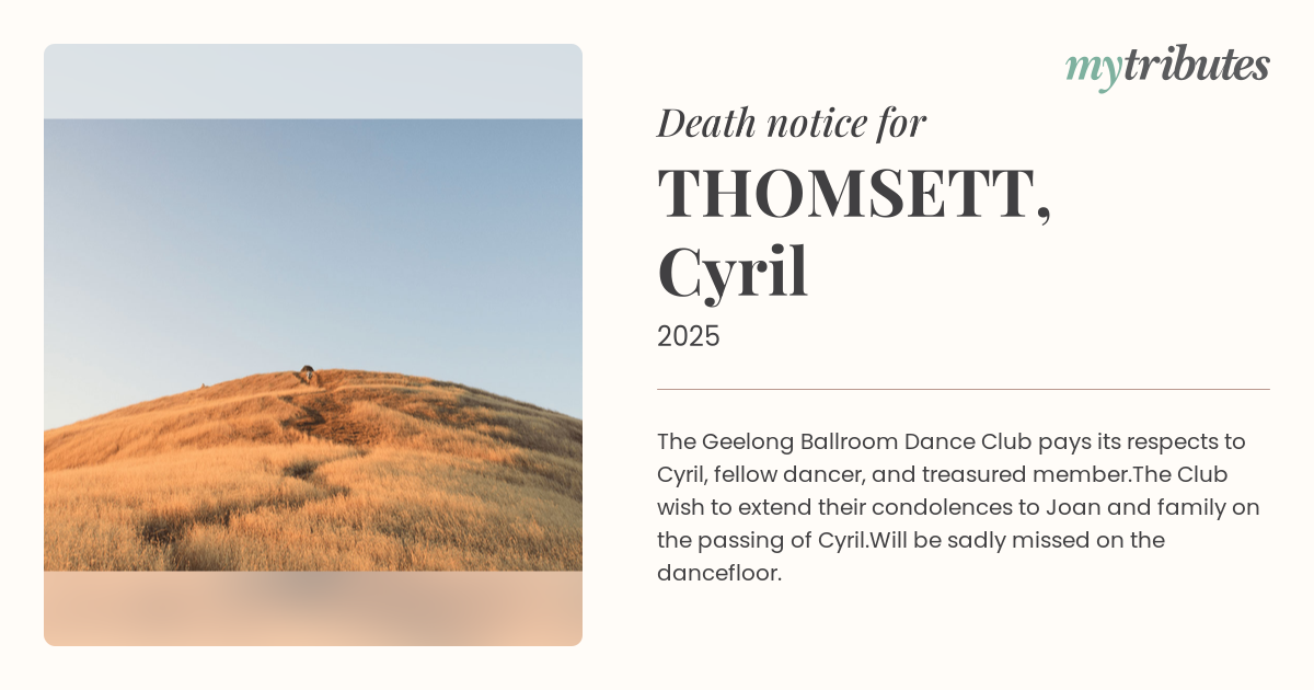 19°CThe Geelong Ballroom Dance Club pays its respects to Cyril, fellow dancer, and treasured member.
