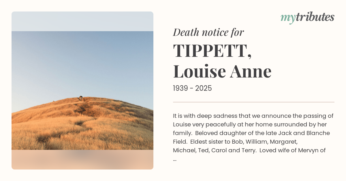 19°CIt is with deep sadness that we announce the passing of Louise very peacefully at her home surrounded by her family. Beloved daughter of the late Jack and Blanche Field. Eldest sister to Bob, William, Margaret, Michael, Ted, Carol and Terry. Loved wife of Mervyn of 63 years. Treasured mother and mother-in-law of Lynne and Chris, David and Amanda and Karen and Frank. Loved Nan of Grant, Ross, Madeline, Hannah, Ellie, Mollie, Jack (dec.), Pru, Lydia, and Sophie. Great grandmother of Primrose.
