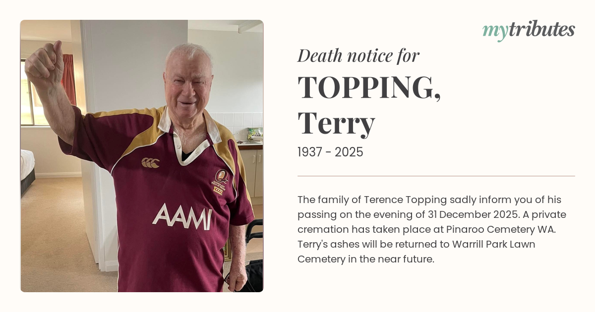 19°CThe family of Terence Topping sadly inform you of his passing on the evening of 31 December 2025. A private cremation has taken place at Pinaroo Cemetery WA. Terry's ashes will be returned to Warrill Park Lawn Cemetery in the near future.