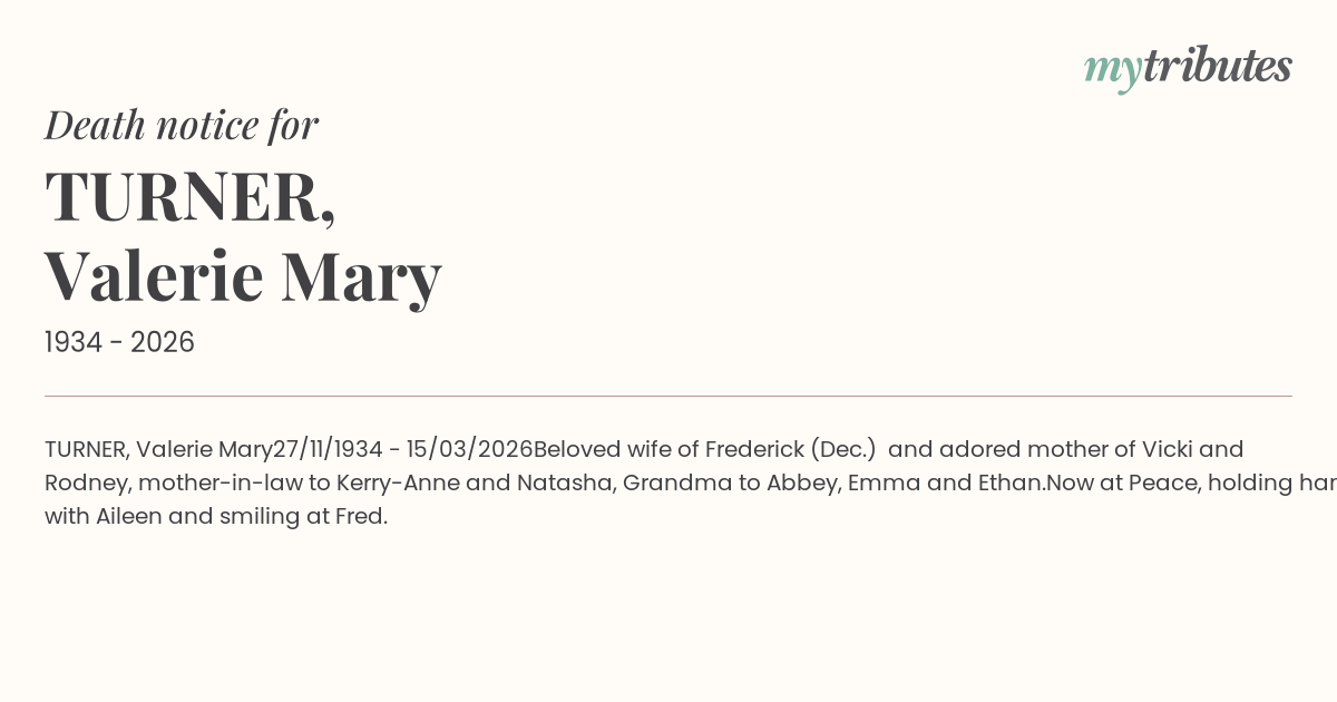 Beloved wife of Frederick (Dec.) and adored mother of Vicki and Rodney, mother-in-law to Kerry-Anne and Natasha, Grandma to Abbey, Emma and Ethan.
