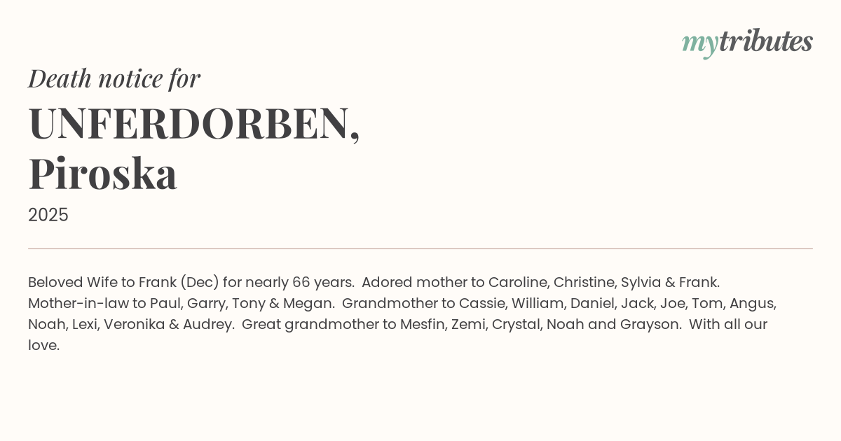 19°CBeloved Wife to Frank (Dec) for nearly 66 years. Adored mother to Caroline, Christine, Sylvia & Frank. Mother-in-law to Paul, Garry, Tony & Megan. Grandmother to Cassie, William, Daniel, Jack, Joe, Tom, Angus, Noah, Lexi, Veronika & Audrey. Great grandmother to Mesfin, Zemi, Crystal, Noah and Grayson. With all our love.