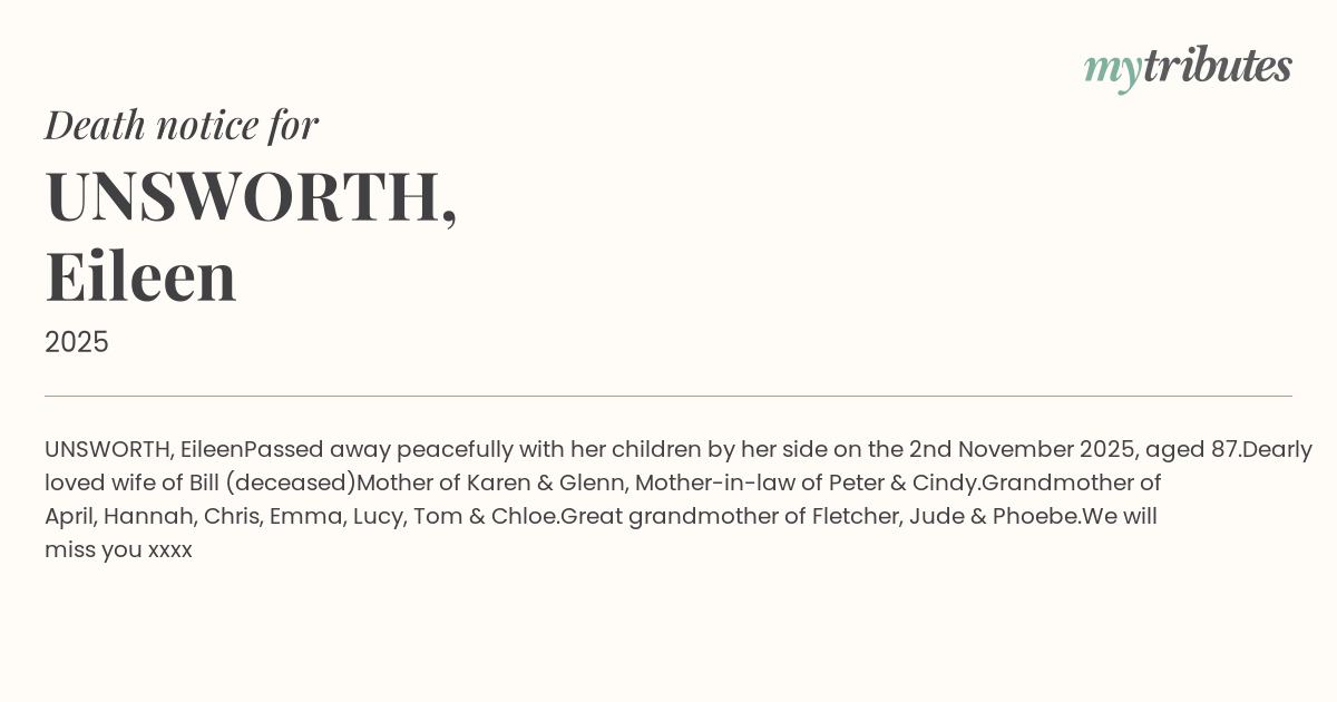 Passed away peacefully with her children by her side on the 2nd November 2025, aged 87.