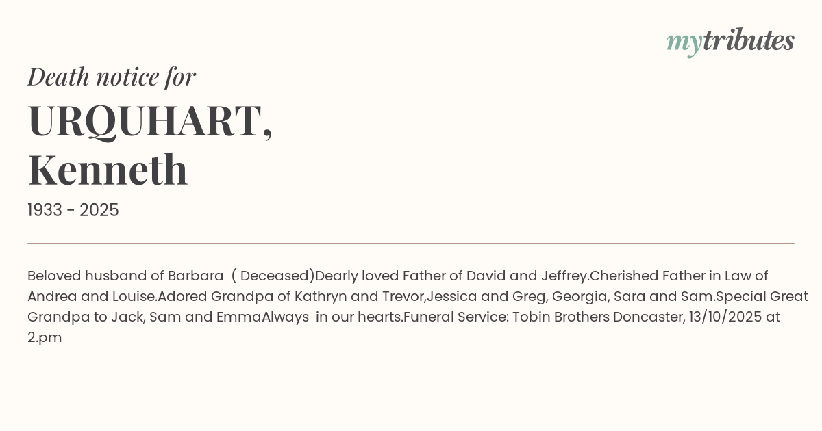 Funeral Service: Tobin Brothers Doncaster, 13/10/2025 at 2.pm