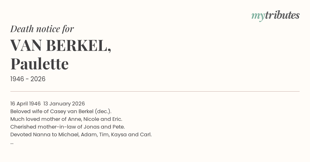 Beloved wife of Casey van Berkel (dec.).