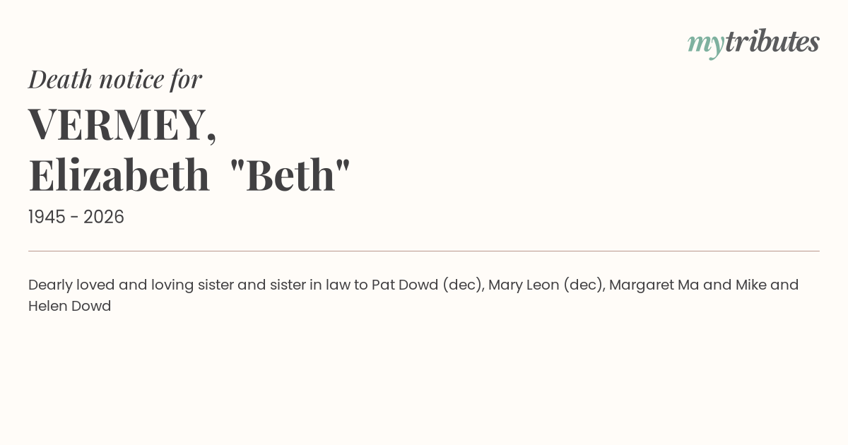 19°CDearly loved and loving sister and sister in law to Pat Dowd (dec), Mary Leon (dec), Margaret Ma and Mike and Helen Dowd
