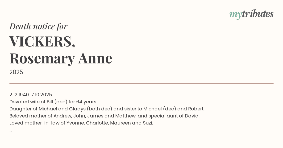 Loved mother-in-law of Yvonne, Charlotte, Maureen and Suzi.