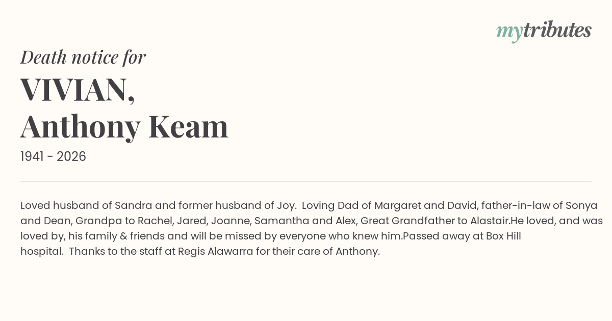 Passed away at Box Hill hospital. Thanks to the staff at Regis Alawarra for their care of Anthony.