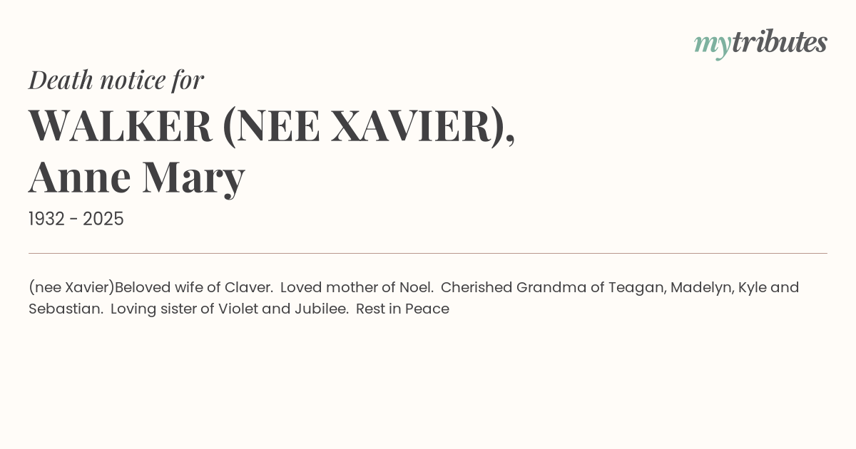 Beloved wife of Claver. Loved mother of Noel. Cherished Grandma of Teagan, Madelyn, Kyle and Sebastian. Loving sister of Violet and Jubilee. Rest in Peace
