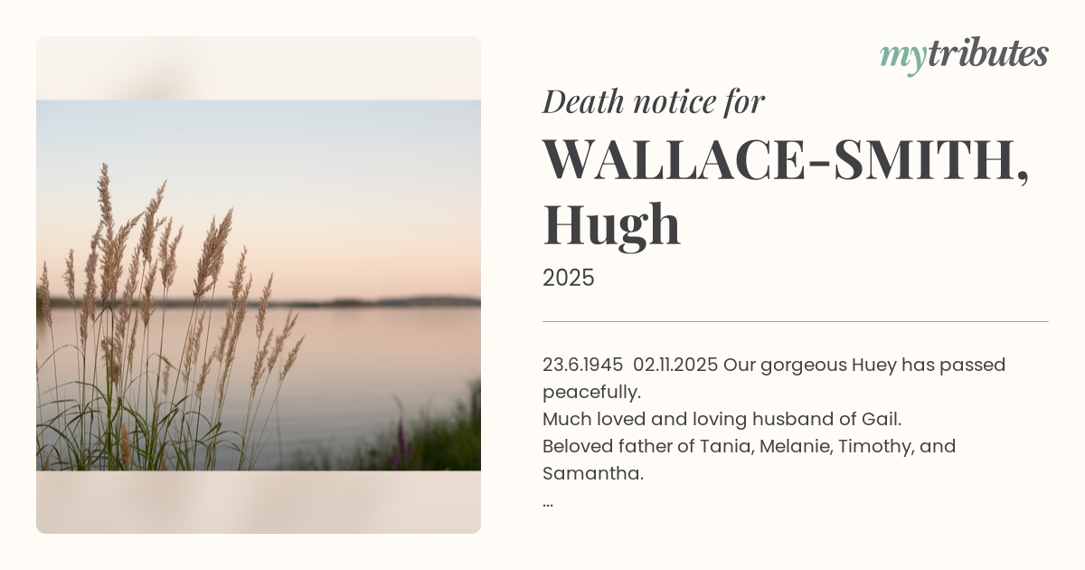 19°C23.6.1945 – 02.11.2025 Our gorgeous Huey has passed peacefully. Much loved and loving husband of Gail. Beloved father of Tania, Melanie, Timothy, and Samantha. Adored Papa to Grace, Hunter, Harper and Harry Missing you already and forever Much love, Gail