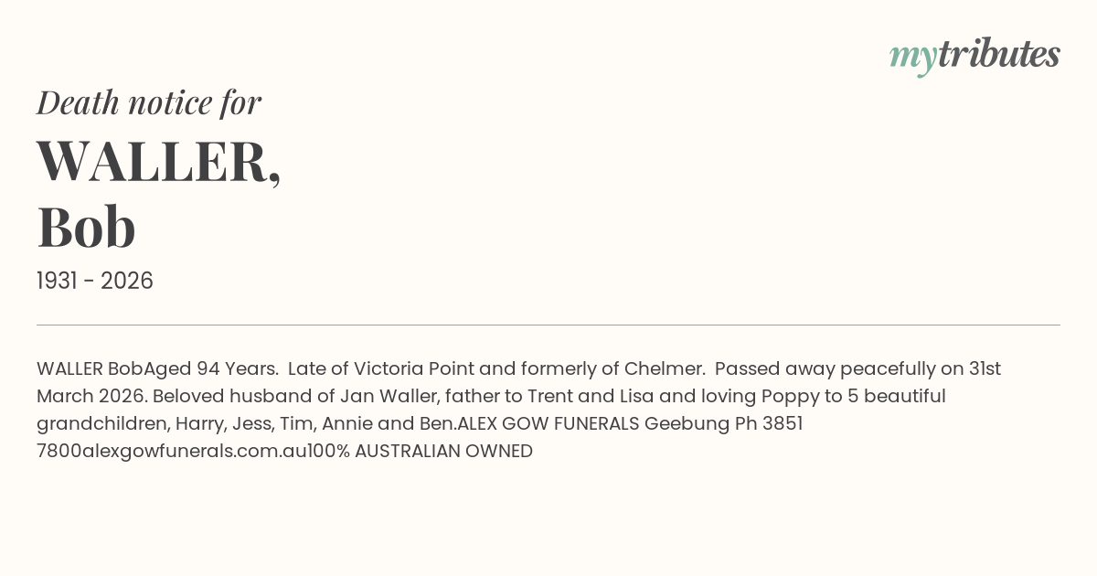 Beloved husband of Jan Waller, father to Trent and Lisa and loving Poppy to 5 beautiful grandchildren, Harry, Jess, Tim,