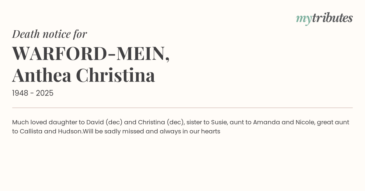 19°CMuch loved daughter to David (dec) and Christina (dec), sister to Susie, aunt to Amanda and Nicole, great aunt to Callista and Hudson.