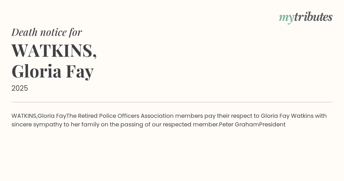 The Retired Police Officers Association members pay their respect to Gloria Fay Watkins with sincere sympathy to her family on the passing of our respected member.
