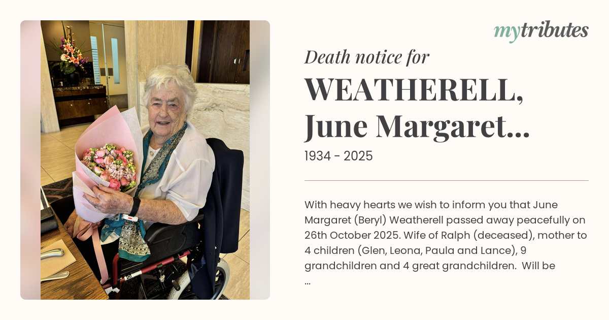 19°CWith heavy hearts we wish to inform you that June Margaret (Beryl) Weatherell passed away peacefully on 26th October 2025. Wife of Ralph (deceased), mother to 4 children (Glen, Leona, Paula and Lance), 9 grandchildren and 4 great grandchildren. Will be greatly missed.