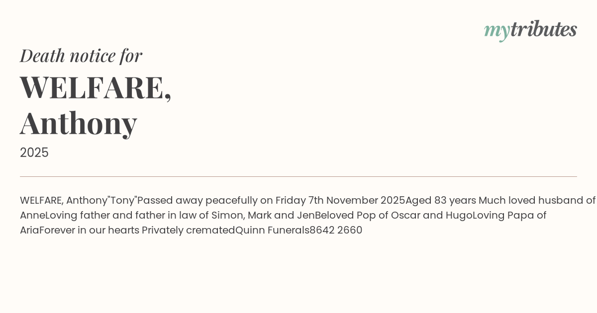 Passed away peacefully on Friday 7th November 2025