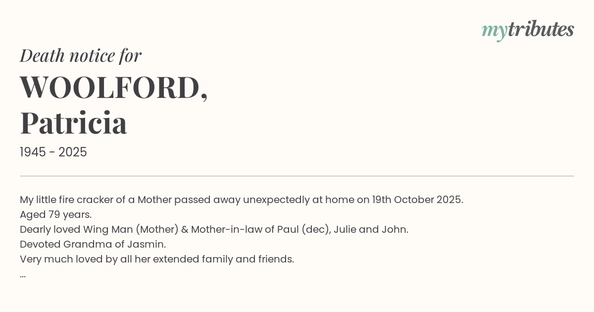 19°CMy little fire cracker of a Mother passed away unexpectedly at home on 19th October 2025.