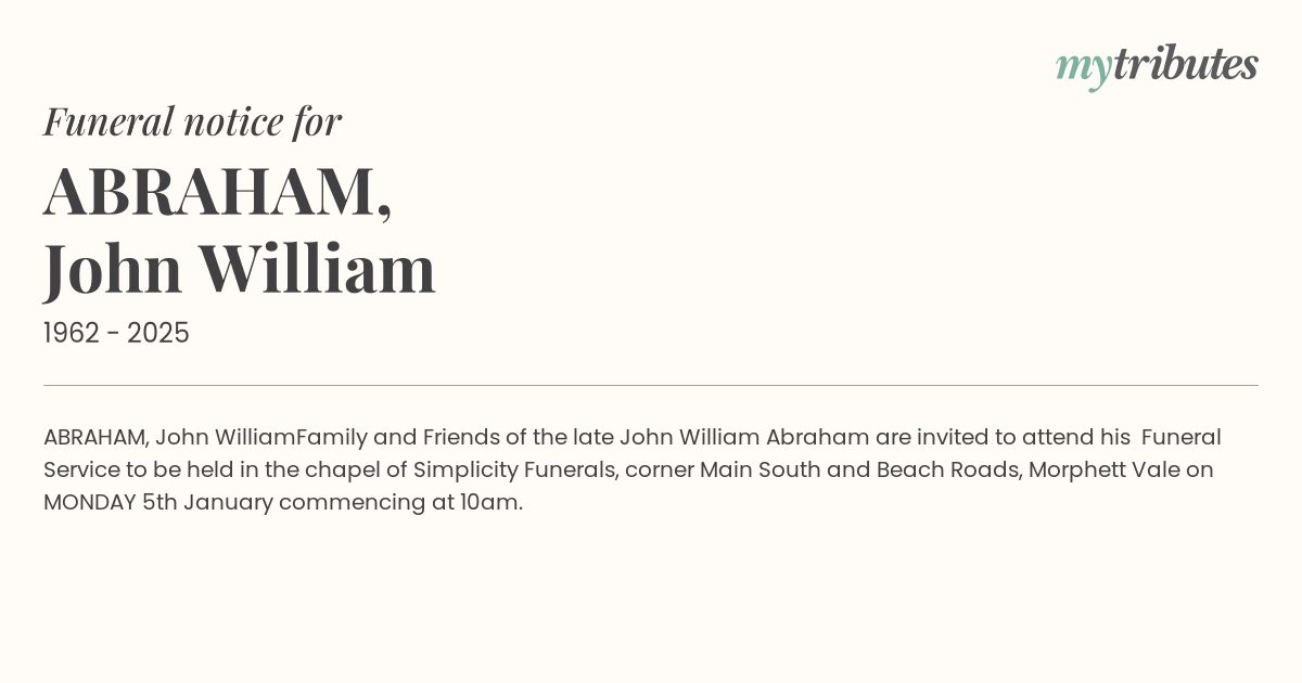 Family and Friends of the late John William Abraham are invited to attend his Funeral Service to be held in the chapel of Simplicity Funerals, corner Main South and Beach Roads, Morphett Vale on MONDAY 5th January commencing at 10am.
