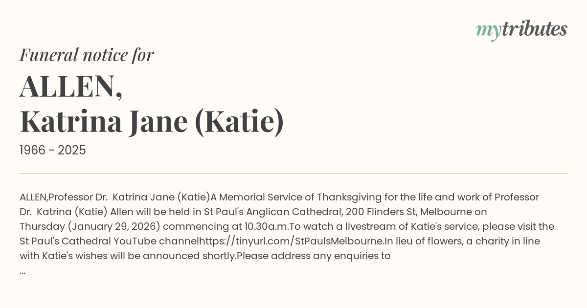 A Memorial Service of Thanksgiving for the life and work of Professor Dr. Katrina (Katie) Allen will be held in St Paul's Anglican Cathedral, 200 Flinders St, Melbourne on Thursday (January 29, 2026) commencing at 10.30a.m.