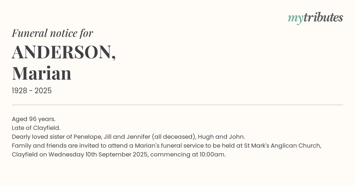 Family and friends are invited to attend a Marian's funeral service to be held at St Mark's Anglican Church, Clayfield on Wednesday 10th September 2025, commencing at 10:00am.