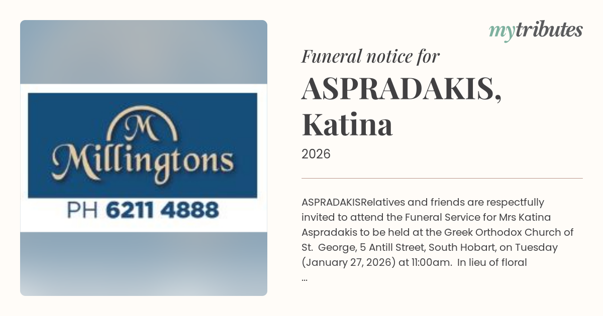 Relatives and friends are respectfully invited to attend the Funeral Service for Mrs Katina Aspradakis to be held at the Greek Orthodox Church of St. George, 5 Antill Street, South Hobart, on Tuesday (January 27, 2026) at 11:00am. In lieu of floral tributes, donations may be made to the Greek Orthodox Church in her memory and will be warmly received at the service.