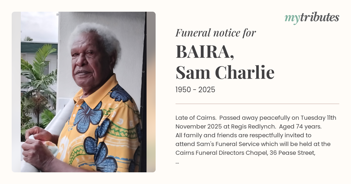 All family and friends are respectfully invited to attend Sam's Funeral Service which will be held at the Cairns Funeral Directors Chapel, 36 Pease Street, Manoora on Wednesday 3rd December 2025 commencing at 10am.